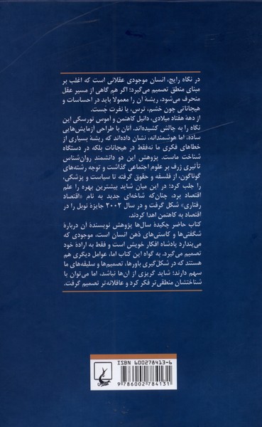 در نگاه رایج، انسان موجودی عقلانی است که اغلب بر مبنای منطق تصمیم میگیرد؛ اگر هم گاهی از مسیر عقل منحرف میشود، ریش? آن را معمولاً باید در احساسات و هیجاناتی چون خشم، ترس، یا نفرت جُست. از ده? هفتاد میلادی، دانیل کاهنمن و آموس تورسکی این نگاه را به چالش کشیدهاند. آنان با طراحی آزمایشهایی ساده، اما هوشمندانه، نشان دادهاند که ریش? بسیاری از خطاهای فکری ما نهفقط در هیجانات بلکه در دستگاه شناخت ماست. پژوهش این دو دانشمندِ روانشناس تأثیری ژرف بر علوم اجتماعی گذاشت و توجه رشتههای گوناگون، از فلسفه و حقوق گرفته تا سیاست و پزشکی، را جلب کرد؛ در این میان شاید بیشترین بهره را علم اقتصاد برد، چنان که شاخهای جدید به نام «اقتصاد رفتاری» شکل گرفت و در سال 2002 جایز? نوبل را در اقتصاد به کاهنمن اهدا کردند. کتاب حاضر چکید? سالها پژوهش نویسند? آن دربار? شگفتیها و کاستیهای ذهن انسان است، موجودی که میپندارد پادشاه افکار خویش است و فقط به اراد? خود تصمیم میگیرد. به گواه این کتاب اما، عوامل دیگری هم هستند که در شکلگیری باورها، تصمیمها و سلیقههای ما سهم دارند؛ شاید گریزی از آنها نباشد، اما میتوان با شناختشان منطقیتر فکر کرد و عاقلانهتر تصمیم گرفت. «این کتاب شاهکاری به قلم اندیشمندی بزرگ است، کتابی خواندنی، حکیمانه و عمیق. بیدرنگ آن را بخرید، اما بادرنگ بخوانیدش. شیو? تفکر شما به جهان و به زندگی شخصیتان را دگرگون خواهدکرد.» ریچارد تالر، برند? نوبل اقتصاد در سال 2017، استاد اقتصاد دانشگاه شیکاگو